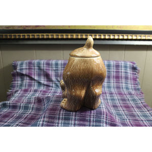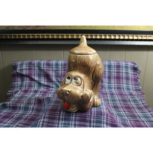 Super cute vintage McCoy signed cookie jar of a dog in a bowed position, looking for play or thinking about what he's done. There is some paint loss to the whites of the eyes and on the tongue and a teeny tiny chip on the end of the tail. No other condition issues. Stands 11 inches tall. Would be great for cookies or dog treats.