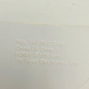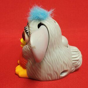 Vintage 1998 McDonald's Happy Meal Furby with gray body, red belly, blue hair tuft, and brown eyes. These plastic figurines were part of a popular promotion by Tiger Electronics.
