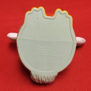 Features: The small plastic toys have movable parts. On the back of the toy, there is often a mechanism, such as a ball to roll, that makes its eyes and ears move or beak open and close.