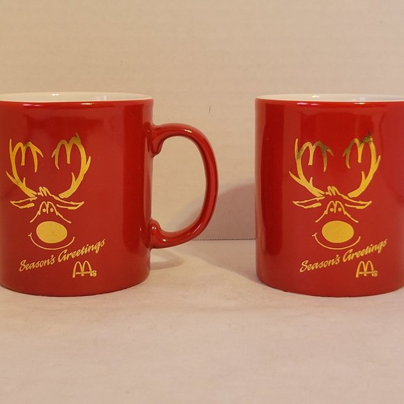 Vintage McDonalds Seasons Greetings Red & Gold Reindeer Christmas Mug-Lot of 2