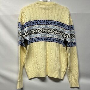 Style: Pullover sweater featuring a cream/light yellow cable knit body with a prominent blue and black Fair Isle patterned band across the chest and arms. Crew neck.