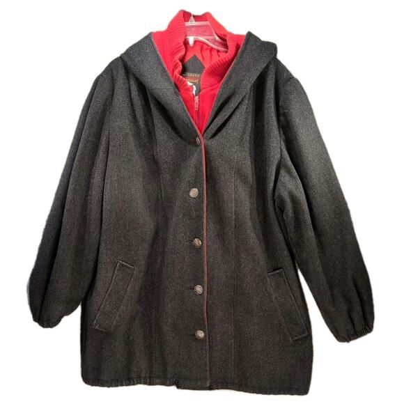 Vintage McIntosh Wool Coat Women’s XXL – Gray with Red Lining, Hooded, Made in USA, Floral Buttons