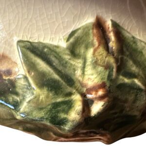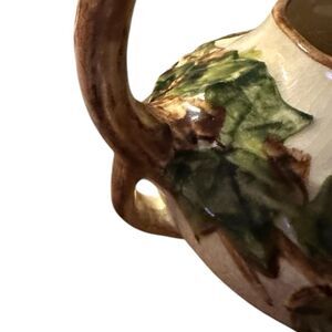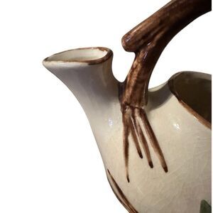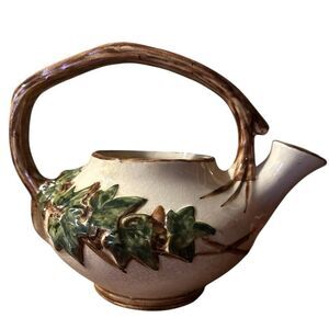 Elevate your tea experience with this vintage hand-painted McCoy Pottery Teapot with a genuine mid-century modern charm. Crafted in the 1940s and originating from Ohio, this round ceramic teapot has a lovely raised green ivy pattern, complemented by a creamy brown finish. The glossy surface adds a touch of elegance, while the ivy motif brings a whisper of nature indoors. Missing Lid. Measuring 8 inches in height, 10 inches in length from the spout tip to the edge of the handle, and 4.25 inches in depth. The teapot does have natural pottery crazing
