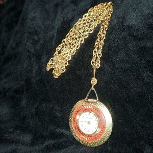 Vintage Mechanical Watch Pendant & Necklace Orange Enamel & Fancy Carved Metal