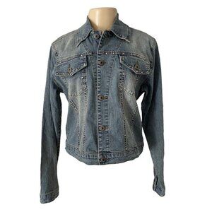 This vintage Mechant stretch denim jean jacket is a must-have for any stylish woman's wardrobe. The jacket features a beautiful studded flower back detail that adds a touch of art and bohemian flair to the piece. With contrast stitching, flap button pockets, and a cropped length, this jacket is perfect for any casual occasion in the summer, fall, or spring.
