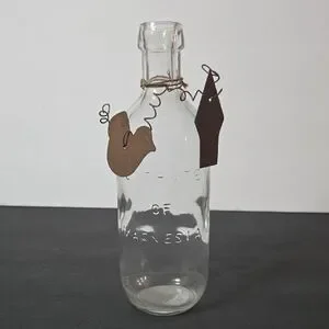 Vintage Medicine Clear Glass Bottle with Brown Metal Tin Tag Charms Bud Vase