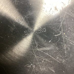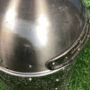 Good used condition, a couple of small rust spots, some scratches and there's a spot where the finish is off on the back, please see photos. You could always remove the pewter tone and just have a nice shiny helmet instead.