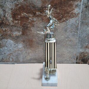 The uppermost part of the trophy features 3 silver-colored figurines engaged in baseball moves. A baseball player swinging a bat, another fielding and base running and catching the ball.
