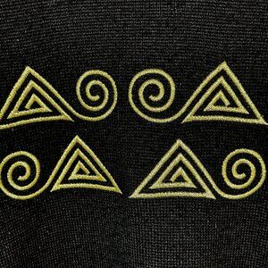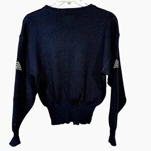 Elevate your winter wardrobe with this vintage Meister wool blend sweater, featuring a striking black knit base adorned with gold geometric embroidery. Crafted in Hong Kong for Hagemeister-Lery, Inc., this Size Small pullover channels quiet luxury and retro ski lodge charm, perfect for layering or making a statement. The 30% wool / 70% acrylic blend offers warmth without bulk, while the spiral and triangle embroidery adds a touch of gilded maximalism. Ideal for lovers of 1980s vintage, dark academia, or celestial-inspired fashion. Dry clean only. Excellent pre-loved condition.