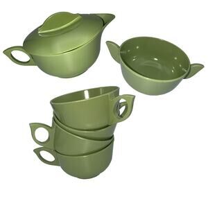 MELAMINE MELMAC TEA SET TEA CUPS SUGAR BOWL CREAMER DINNER WARE CHIC TABLEWARE MELAMINE SET VINTAGE 1950S MID CENTURY HOME DECOR AVOCADO GREEN