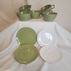 Vintage Melamine Coffee Set – 7 Cups + 8 Saucers (Green & White)