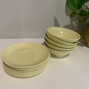 Vintage melamine in pastel yellow. Five bowls and seven saucer plates. All in great condition.
