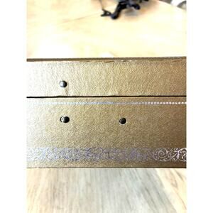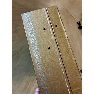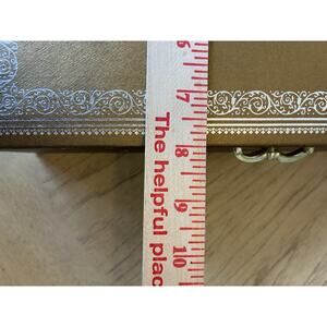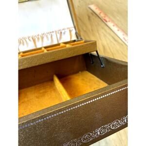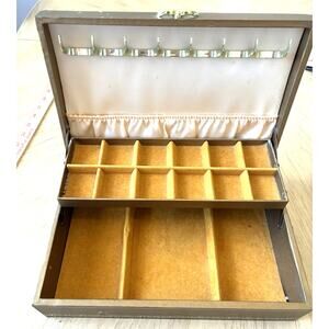 Look at pictures. This is very old but in good condition. Inside looks great. To tears just a little spotting from being extremely old! So cool and retro!! This is like 70 years old. The Vintage Mele & Co Jewelry 2 Tier Box in Gold Tone with a Yellow Inside is a stylish and practical jewelry storage option for any jewelry lover. This rectangular box features a cream color and is lined with a felt "velvet like" material for added protection. Made of faux leather and sourced from the United States in the 1950s, this vintage piece exudes a Mid Century theme and is suitable for storing necklaces, bracelets, anklets, rings, cufflinks, earrings, and body jewelry. Perfect for both men and women, this jewelry box offers a touch of nostalgia and elegance to any dresser or vanity.