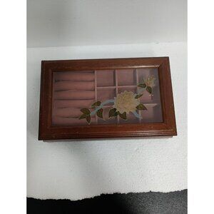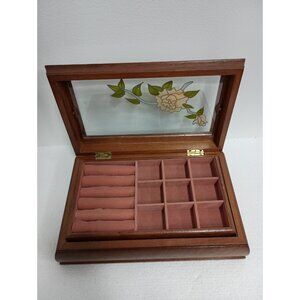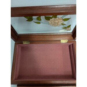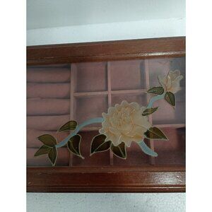 Vintage Mele Japan Solid Wood Jewelry Box Clear Glass Lid Painted Floral Design