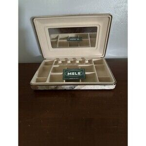 The Vintage Mele Mirrored Jewelry Box is a charming rectangular box made in the USA with 12 compartments, perfect for organizing rings, earrings, and other small jewelry items. The fabric lining adds a soft touch, while the mirrored surface adds a touch of elegance. This vintage piece is a stylish and practical addition to any jewelry collection, offering a unique design that showcases your favorite accessories in a beautiful and organized manner. Measures 10.5X6.5X2.