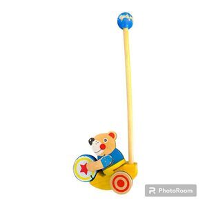 Vintage Melissa & Doug Drumming Bear Push Toy. Wooden toy with metal drum. Play condition due to drum being a little dented and scratched. As well as paint being scratched and scuffed on the wooden part. No broken parts, in working order!