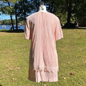 In a very light pink, this two-piece outfit is a 1980s vintage gem. Long oversized tunic top with feminine and elegant lace trim. Underneath is your mini pencil skirt. The material is rippled/textured. Hidden back zipper. Add your own shoulder pads if you want an authentic 80s look. Marked size 16. May fit size 14 better. Check the measurements for yourself please. Made in the USA. Sweet, romantic and in nice condition.