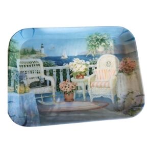 Elevate your serving ware with this charming set of vintage Melplus Monza melamine trays, embodying the timeless 'Coastal Grandma' aesthetic. Crafted in Italy by R2S, these trays feature serene seaside scenes with wicker chairs, blooming hydrangeas, and gentle ocean vistas—perfect for adding a touch of coastal elegance to your home.