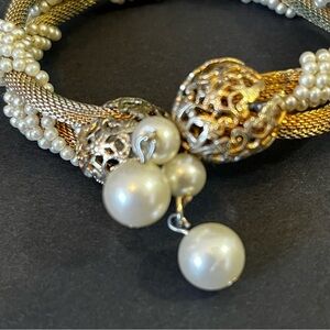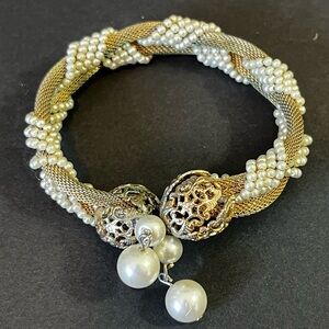 Vintage Memory Wire Wrap Bracelet Gold Tone White Bead Dangle Art Deco Victorian