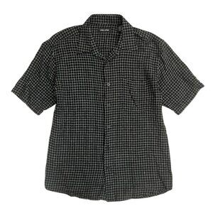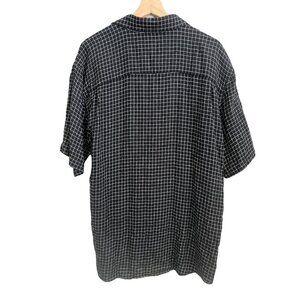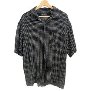 Vintage Men Linen Check Print Short Sleeve Button Up Shirt Black XL Retro Resort