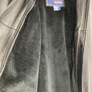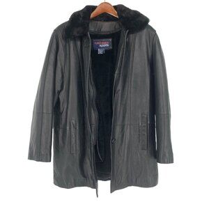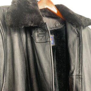 This vintage NY Classics Sports black leather jacket in men's size small combines timeless style with practical cold-weather features. Crafted from 100% genuine leather with a soft black faux shearling lining, it offers both warmth and sophistication. The jacket features a full button front, exterior pockets, and a zip-in removable vest liner and collar for versatile wear across seasons. A plush faux fur collar adds extra comfort and a touch of vintage flair. Ideal for winter layering or sleek streetwear looks, this leather coat is professionally leather dry clean only and made in China, dating from the late 1990s to early 2000s.