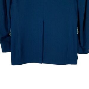 Features: rayon woven fabric in Blue. Wide spread notch lapel. Faux chest pockets. Front flap pockets. Inner Pockets. Marble swirled buttons.