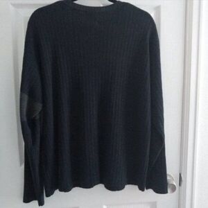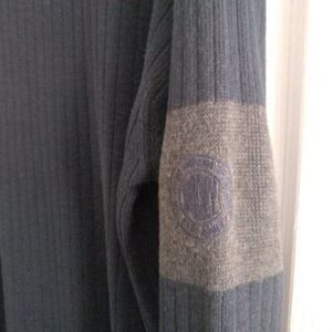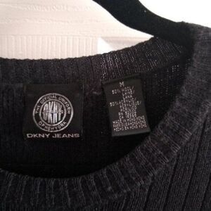 Vintage Men's DKNY Jeans sweater in Dark Navy Blue with a gray logo band on the sleeve. Sweater is in good pre-owned condition, no rips, snags, little to no pilling.