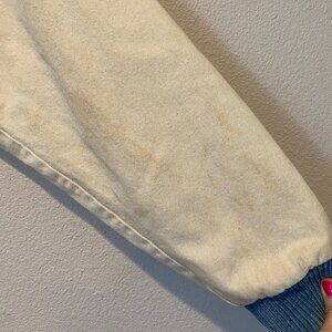 This vintage men's denim bomber jacket is a rare find, featuring embroidered "Grower, Shipper, Vegetable Association" detail on the chest. A classic Turning Point brand piece with a unique blend of denim and off-white contrast sleeves, this jacket is a standout addition to any vintage collection.