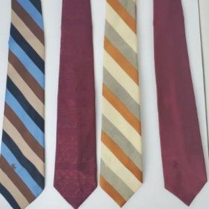 Sleek slim width tie (not wide and not skinny) looks perfectly classic in simple angled stipes and solid with unicorn logo. Great for the office or a night on the town. Silk like feel to them made with quality material it could be a blend. Two royal purple and two stripes brown and blue also beige and pecan color.