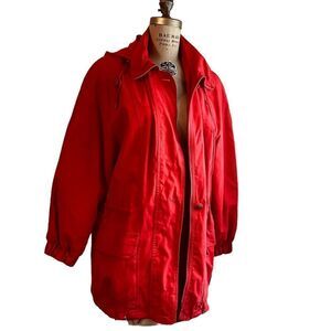 Vintage Men’s Forecaster of Boston Red Rain jacket with detachable hood size X small. Lightweight rain jacket with button in hood, 2 big pockets on outside, drawstring at waist and bottom hem .would font a woman as size Large. in great condition just has a button missing at bottom
