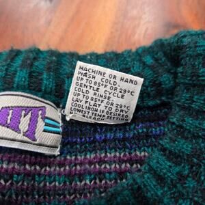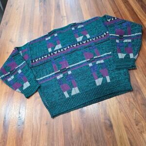 Permit vintage geometric knit sweater. This unique sweater features a bold geometric pattern that captures the essence of the 80's and 90's fashion. Perfect for adding a touch of retro style to your wardrobe!