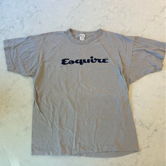 Classic Champion short sleeve tee with Esquire logo on front. Soft gray knit cotton shirt, logo is in dark navy blue. Straight hem and crew neckline. Only one small stain on the neck. Labeled as a men’s XL but fits more like a large.