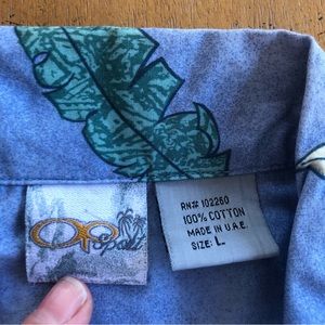 Men's large short sleeve Hawaiian shirt in light blue, green and white. Palm leaves, tie dye look. Full button and collar. Excellent condition, see measurements in photos. Polynesian. OP Ocean Pacific, 100% cotton.