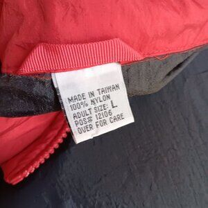 This vintage windbreaker jacket offers superior protection against the wind, combining style with functionality. The bold red and black color scheme enhances its classic appeal, making it suitable for outdoor activities or casual wear. Its lightweight nylon material ensures comfort and ease of movement.