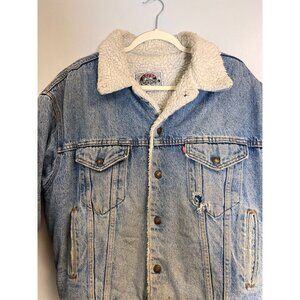 This Levi's denim jacket features a cozy sherpa lining, offering both style and warmth. Its vintage distressed look makes it an ideal choice for casual wear.