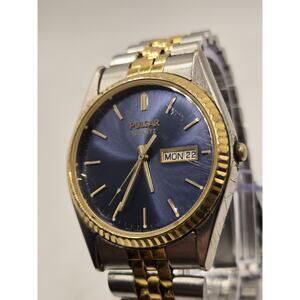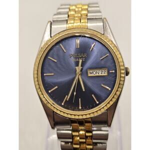 The Vintage Men's PULSAR Two-Tone Silver Dial Watch with Day/Date features a classic design with a gold bezel and dial, complemented by a stainless steel strap in silver gold tones. The quartz movement ensures accurate timekeeping, while the baton indexes add a touch of elegance. This Seiko Pulsar model with a 35mm case size is perfect for men who appreciate a timeless and reliable wristwatch with distinctive style.