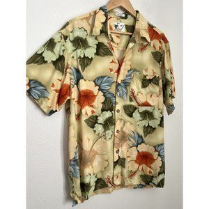 Vintage Mens Ron Chereskin Size L Hawaiian Shirt Tropical Yellow Wooden Buttons
