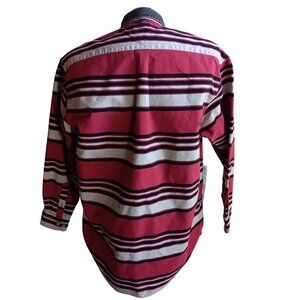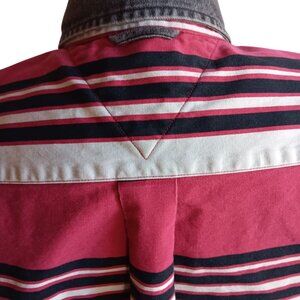 Experience the classic charm with this Vintage Men's Large Shirt from the 1990s by Tommy Hilfiger. This Brush Popper Striped shirt is all cotton, boasting a vibrant red color.