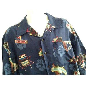 Vintage Men's Shirt Large L Hawaiian Hotel Motel Signs Aloha Rayon Blue
