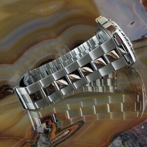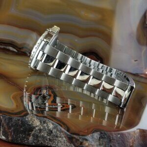 Vintage Mens Silver & Gold TN ARMITRON Chronograph Watch ~ White Dial ~ Blue Chronograph Sub Dials Feature Day Date & Military Time ~ Polished Silver Tone Bezel with Gold Tone Accents ~ Fold Over Clasp ~ Excellent Condition ~ New Battery Installed Runs Great ~ 38MM Wide Case ~ Watch will fit up to a 7.75" Wrist ~ All Sales Final on Watches.