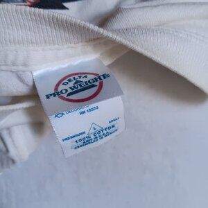 Vintage Men's T-shirt with Chicana Lowrider Pinup Girl design. Made in the USA by Delta. Large size, white color, 100% cotton for comfort and durability.