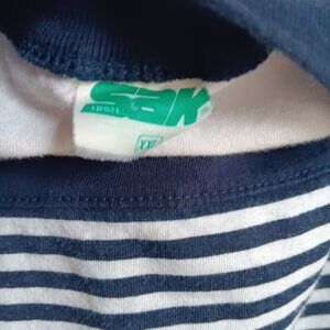 24 pit to pit, 22 shoulders, 27 shoulder to hem - has lots of small holes on the front in the lower stripes area - thin and buttery - real stitched embroidery