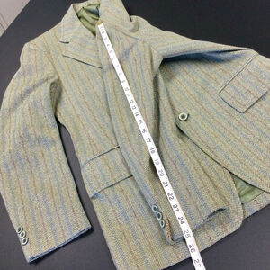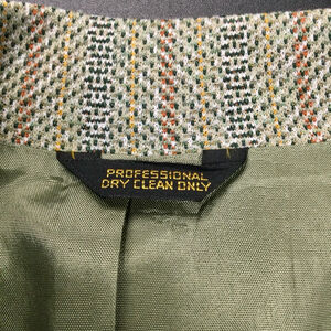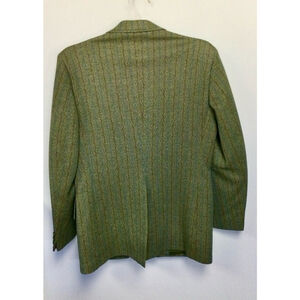 This is vintage a pre-owned blazer featuring a green and brown herringbone pattern. The blazer has a two-button closure and two flap pockets at the front. The interior is lined with a green fabric. The blazer measures approximately 33 inches in length and 20 inches across the shoulders. There are three buttons on each sleeve cuff. The blazer is in excellent vintage condition.