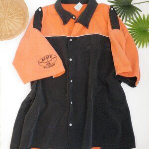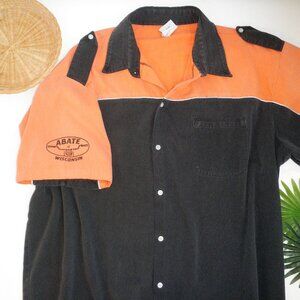 This is a really fun vintage Abate of Milwaukee Motorcycle Club Region 1A faded orange and black mechanics shirt with white trim. There are button tabs at the shoulders. It is made by Speed Zone Race Gear and is a cotton/poly blend. The back has a large print of the Abate of Wisconsin and one sleeve has a smaller print. It is nice and broken in and has that vintage feel and look to it.