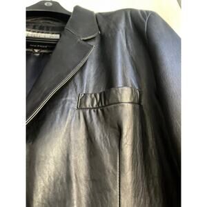 Single breasted three quarter length very soft genuine leather jacket. Notch lapel, three button closure. One interior pocket, three exterior pockets. Extra buttons.