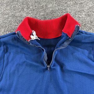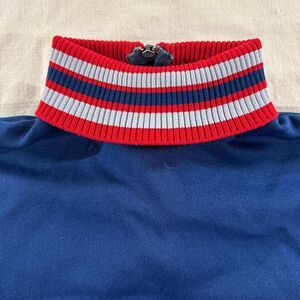 blue nylon, mock neck, striped cuffs, vintage sporty, 1960s70s, retro athletic, gray stripe detail, zip back, fitted style, nostalgic athletic