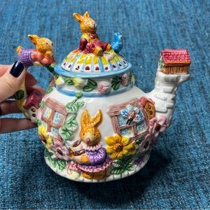 Vintage Merc Asia 1999 Garden Party Ceramic Tea Pot Bunny Rabbit Floral