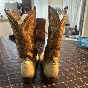 Step into authentic Western heritage with these vintage Mercedes cowboy boots. Featuring a striking two-tone design in tan and brown leather, they showcase classic Western stitching and pull straps for easy wear. These boots have clear signs of use, adding to their rustic character and appeal. Perfect for collectors, Western enthusiasts, or anyone looking for a rugged vintage style with plenty of life left.
