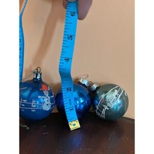 Adorable, vintage, Christmas ornaments that appear to be hand painted. One has a snowy, Snowman scene, another has a simple landscape scene that includes a horse and fence. The last ornament is just plain blue mercury glass. Measurements in photos. Typical wear for these type. Very fragile.