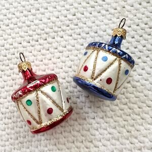 Vintage. Unmarked. Mercury glass set of 4 Christmas holiday ornaments. Designs include two drums - red and blue - Nutcracker soldier and Santa figure. Handpainted. Preowned in good condition with no stains or tears.